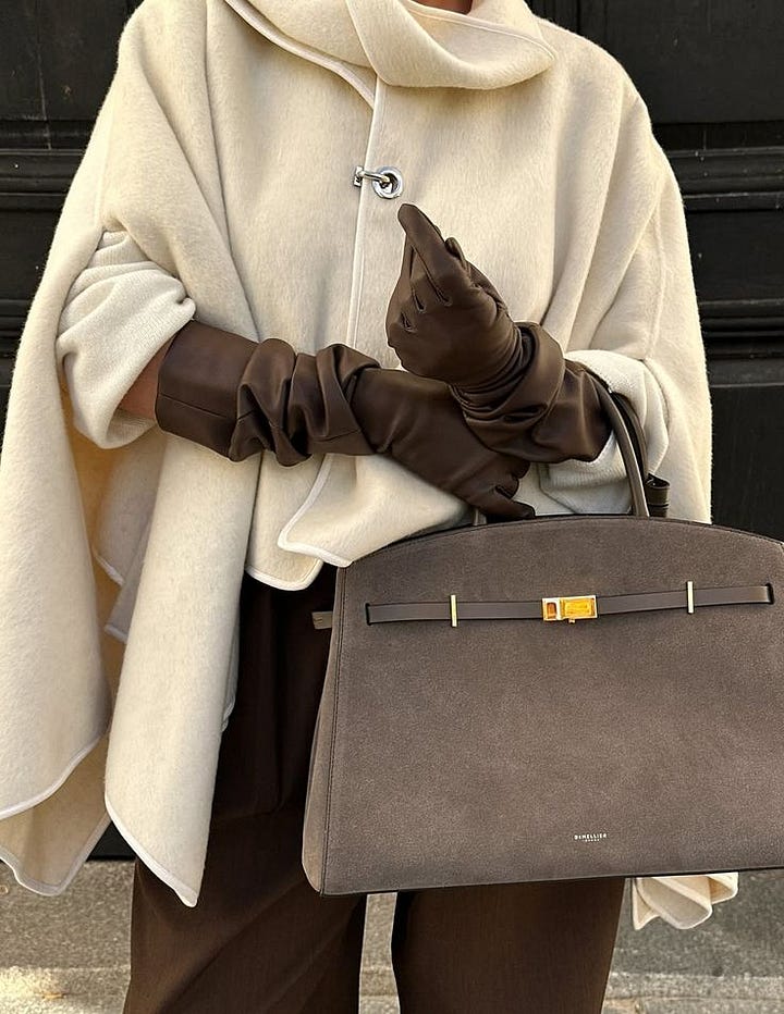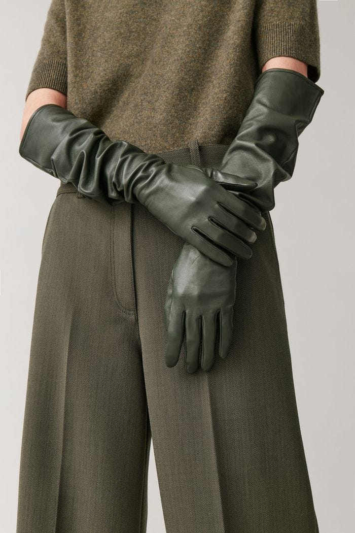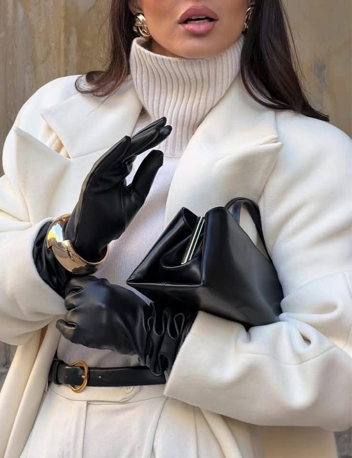 Leather gloves, particularly longer opera-length styles, feel both practical and undeniably chic for winter. Styled with bracelets layered over the top, they add a playful and fashion-forward edge to cold-weather dressing.